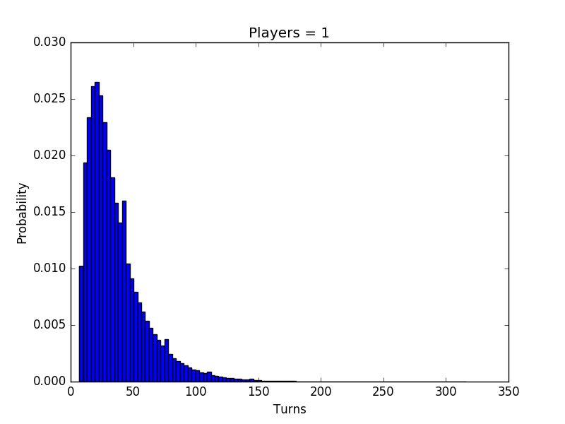 Cumulative distribution function for Snakes and LaddersThe mean number of turns for all one million games was 36.2, which is not too far off the initial estimate of 38. What I really want to point out though is the long tail of the distribution. Some games take a really long time. In the simulation there was one game that took 316 turns! Looking at the cumulative distribution function we can see that it’s not too uncommon to find yourself in a game that lasts 50 turns or more. There is a roughly 20% chance that a game will last at least 50 turns, and about a 5% chance that a game will last at least 80 turns.